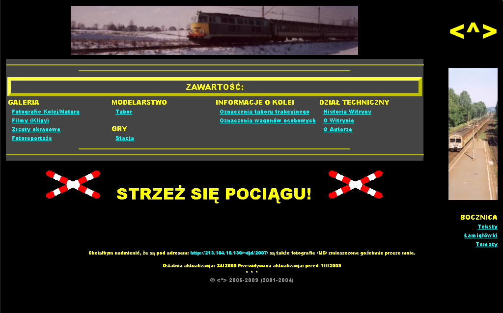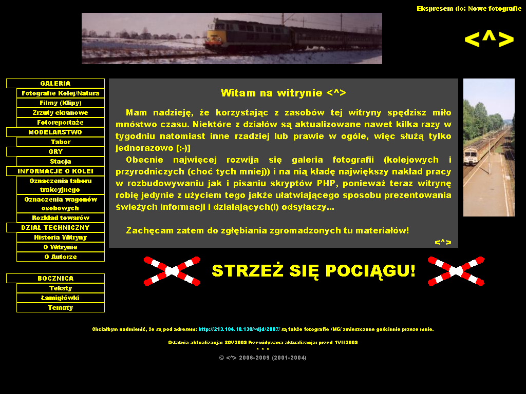21VII2009 | 0.9.6.0 | Odnowiono grutownie wygląd strony startowej tak, że w końcu mi się podoba i moje zadowolenie starczy na dłużej... :). (Stara wersja wyglądała w ten sposób). Ponadto strona jest znów obecna w sieci dzięki www.kolej.org.pl. |
